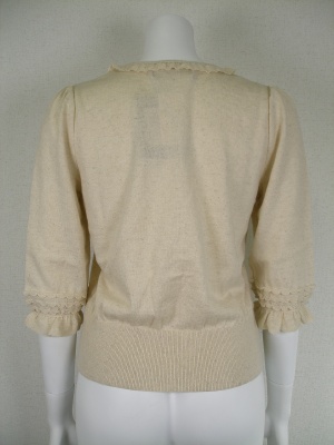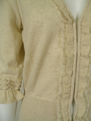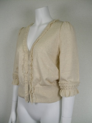 ナチュラルな風合いのフリルが可愛いカーディガン。フロントはカギホック留め。ショート丈なのでワンピースに羽織ってもバランスがいいですよ。