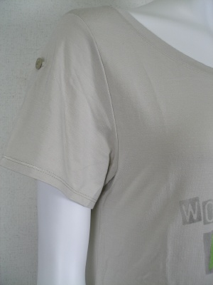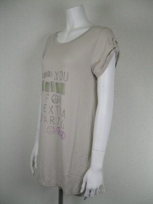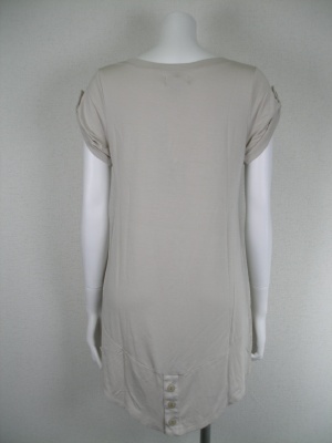 Aラインで後ろ下がりのロングTシャツ。とてもストレッチの効いた素材。お袖はくしゅっとさせてボタンで留めてありますが、外すと普通の半袖になります。