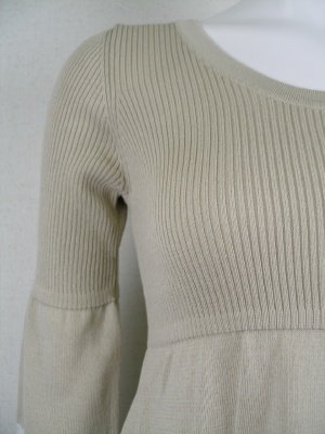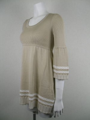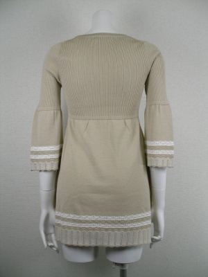 袖と裾の刺繍風フリルがかわいいニットチュニックです。 ひじ上から広がる袖のデザインが、腕を細く見せてくれます!