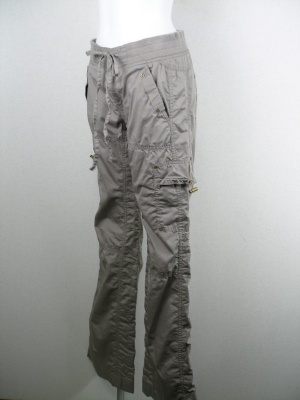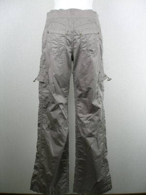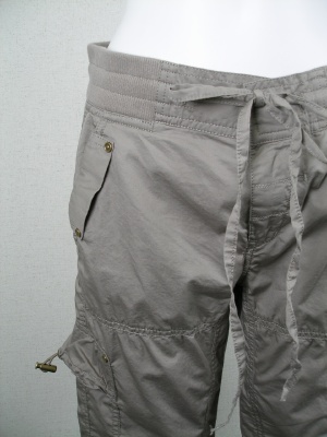 サイド全体に細かく入ったギャザーで立体感を出したカーゴパンツ。 ウエスト部分はゴムになっていて、紐で調節できます。