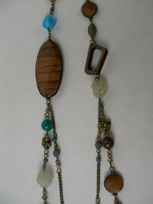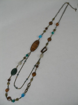 途中から2連になったロングネックレス。メタルパーツ以外は合成樹脂。ナチュラルテイストのチュニックやワンピースによく合います。