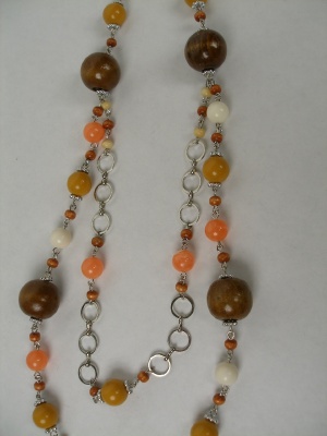 途中から2連になったロングネックレス。ウッドと合成樹脂のビーズを使用。チュニックやワンピースによく合います。