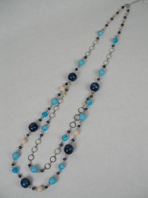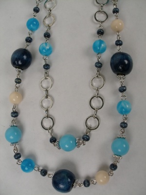 途中から2連になったロングネックレス。ウッドと合成樹脂のビーズを使用。チュニックやワンピースによく合います。