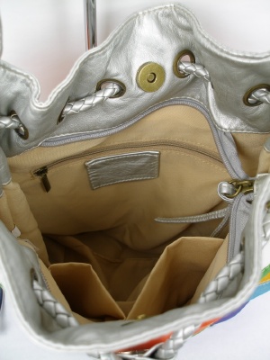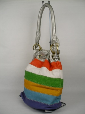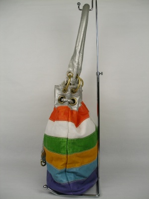 マルチカラーのボーダーで持ち手はシルバー、ちょっと懐かしい形のバッグは「レトロマリン」な雰囲気。ファスナーとホックも付いています。