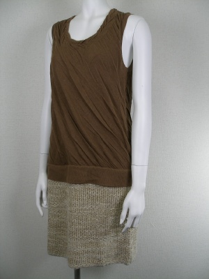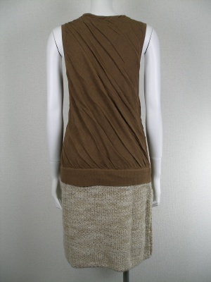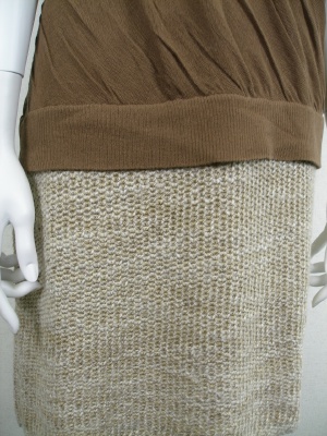 少し斜めにねじった薄手ニットと、太い糸のざっくりニットスカートを合わせたワンピース。裏地なし。