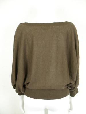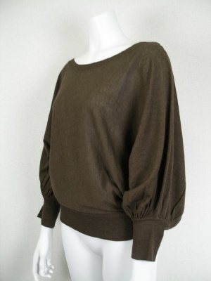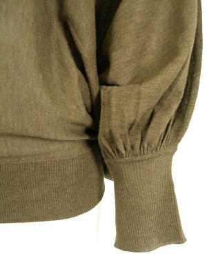 ナチュラルな色合いのドルマンスリーブニット。袖口にギャザーを入れボリュームアップさせてありますが、薄手のニットなのでスッキリ見えます。