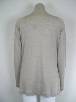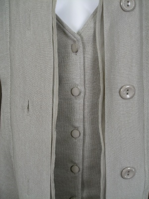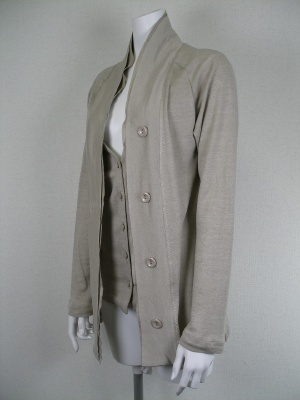 カーディガンの中にベストを着ているようなデザイン。カーディガンはボタンを留めずにサラリと。別布:シルク100%。