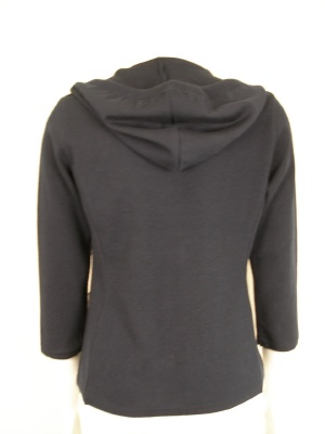 裏無しのニットジャケット。テーラードのような襟元ですが、後ろはフードになっています。