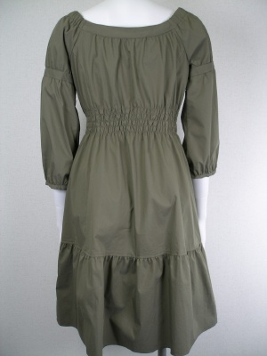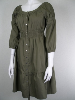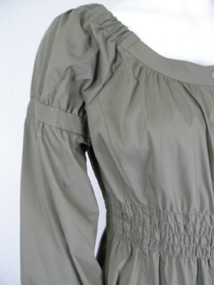 ハリのある素材で、スナップボタン留め。前を開けて、重ね着してもOK。裏地なし、ウエストと肩の部分にはゴム入り。