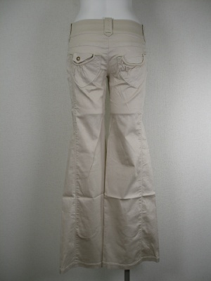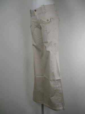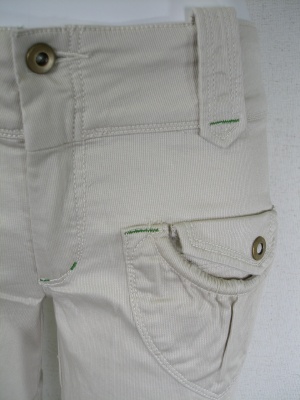 明るいベージュに同色のステッチ、ポケットとベルトループに一部グリーンのステッチ。綿ストレッチ素材。
