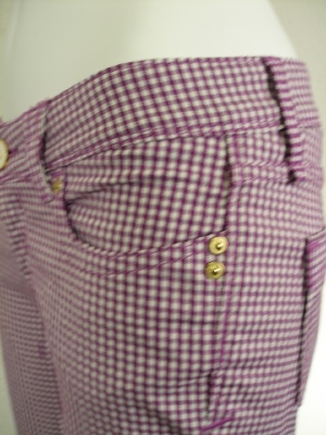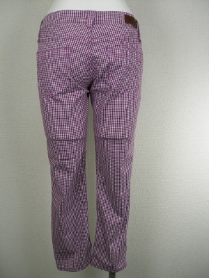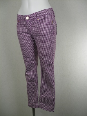 ヤヌークのギンガムチェックデニム・・クロプト丈で裾は細い パープル色が珍しい(25サイズ)