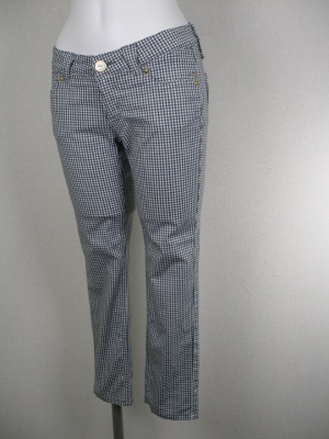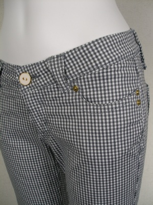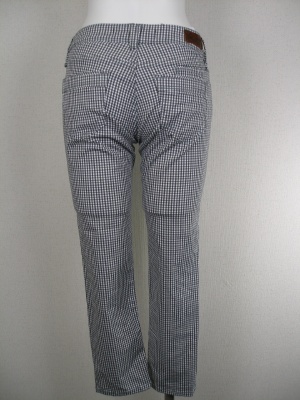 ヤヌークのギンガムチェックデニム・・クロプト丈で裾は細い パープル色が珍しいグレー系(24サイズ)