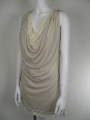 カットソーとニット地が二枚合わせになって肩で閉じてあるデザイン フロントのドレープがとてもオシャレで体のラインを上手にカバーしてくれる。