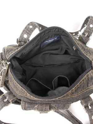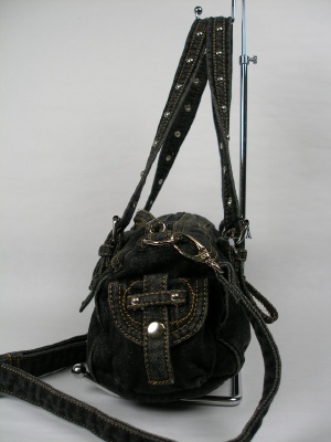 ブラックデニム地の2WAYショルダーバッグ。持ち手は取り外しができます。外ポケット4つ、内ポケット3つあります。
