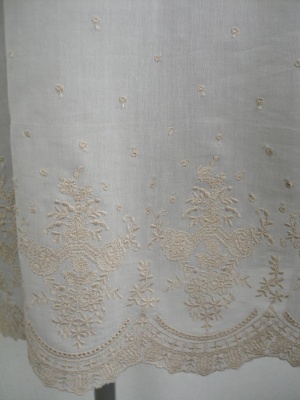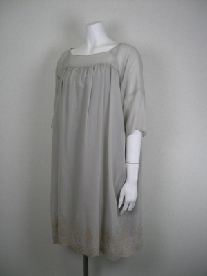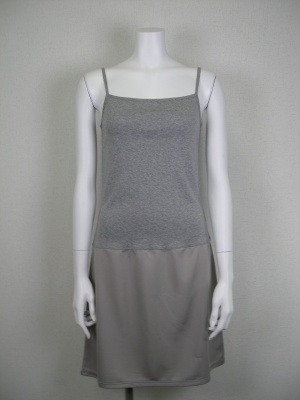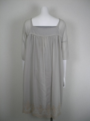 キャミワンピタイプのペチコート(身頃:綿、スカート部:ポリエステル)と2枚組み。広めに開いたスクエアネックなので、今の時期はタートルなどと重ね着もできます。 ふんわりシルエットと裾の刺繍でフェミニン度アップ!