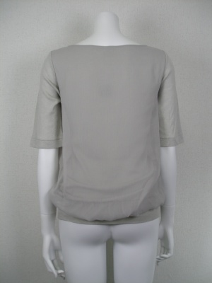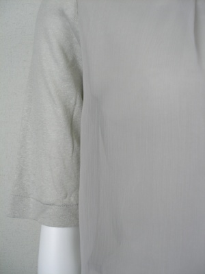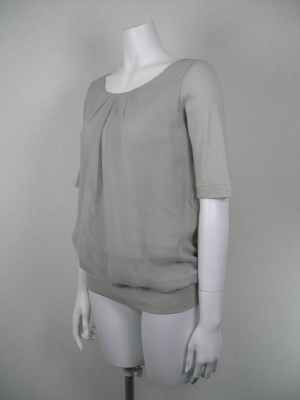 五分袖のカットソーのうえに身頃部分だけシフォン(ポリエステル)を重ねたデザイン。袖と裾のフィット感とシフォンのふんわり感のバランスがちょうどよく、ボトムスを選ばない1枚です。