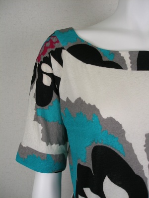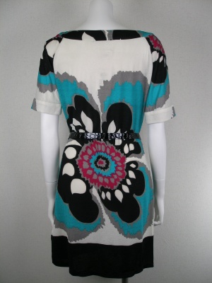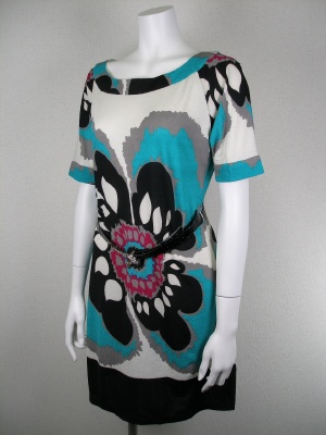 大胆な花柄のワンピース。付属のベルトは黒で型押し、バックルはキラキラ付きの鍵モチーフ。シルク100%ですが伸縮性があります。裏地なし。