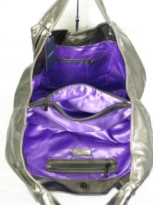 シルバーにもゴールドにも見えるような色合い。中は鮮やかなパープル。真ん中に仕切りがあり、使いやすいデザインです。