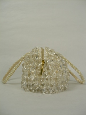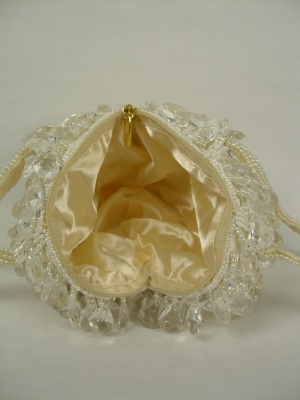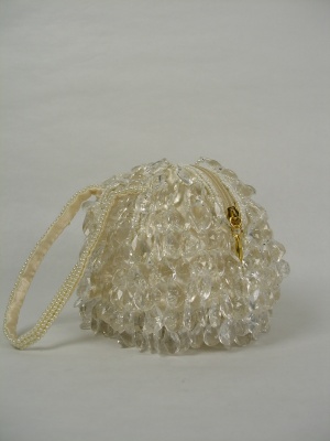 コロンと丸いフォルムが可愛いパーティーバッグ。オフホワイトのサテン地に小さな白いビーズ、パールビーズを使い、全体にはクリアな大きめしずく型ビーズをぎっしりと。