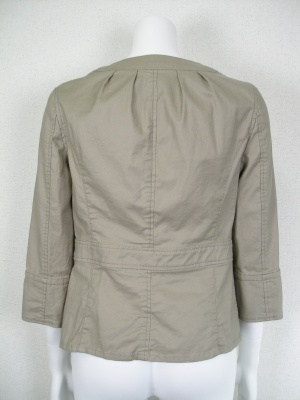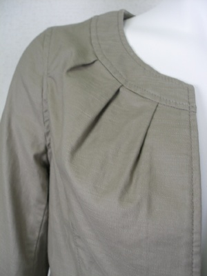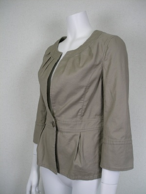 フロントに一つボタンがあるノーカラージャケット、襟元とウエストラインにタックを寄せて少し立体感を出したデザイン