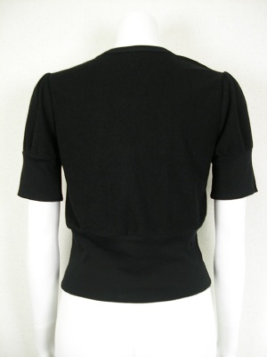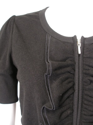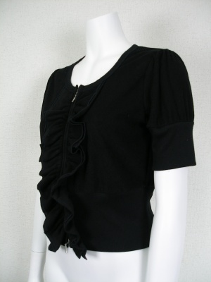 前立てのフリルが特徴的なカーディガン、前ファスナーでキュートさの中にスポーティを重ねたボレロ風