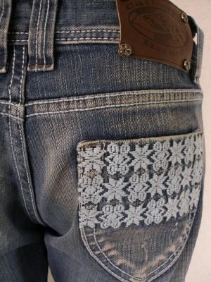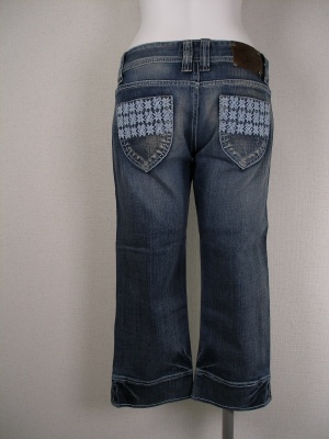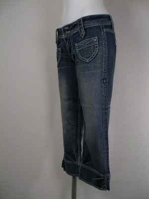 白のステッチとヒップポケットの刺繍がポイントの、スッキリ細身クロップドデニム。裾にスリット入りでストレッチ素材です。
