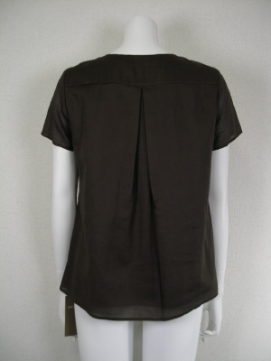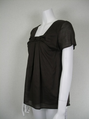 スクエアカットの襟元にギャザーを寄せえてさらにタックをもてせてふんわり感を出したブラウスチュニック