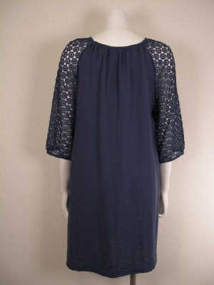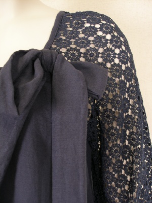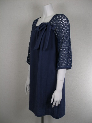 お袖の繊細なレースと胸元のリボンがポイント。肩から袖にかけてのレース部分は透けます。ストンとしたシルエットのワンピース。裏地無し。