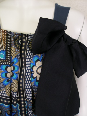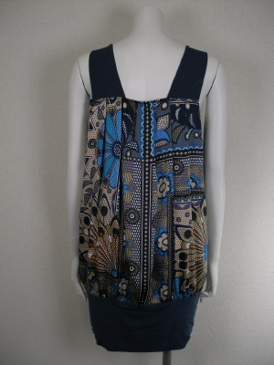 ツルッとした素材で、プリントが鮮やかな裾すぼまりのチュニック。ストラップと裾の無地部分はストレッチ素材。