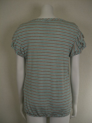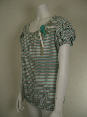滑らかでストレッチの効いた素材。お袖の上にティアードを重ねてボリュームを出しています。胸元の飾りはブローチなので取り外せます。