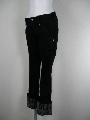 ストレッチデニムのスリムストレート。裏面が英字プリント(キャサリンハーネルのロゴ)なので、ロールアップして。とても伸縮性のある素材なので、いつもよりワンサイズ小さめでお召し下さい。
