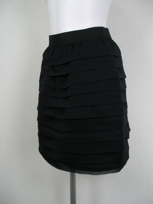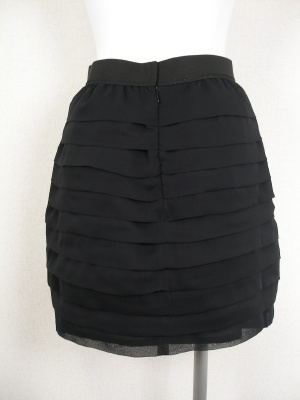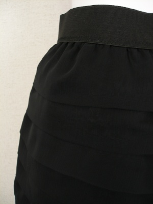 ポリエステルのシフォンをギャザーを寄せずにティーアードにして、ボリュームをおさえてあります。ウエストのベルト部分自体がゴムで、裏地はキュプラ。