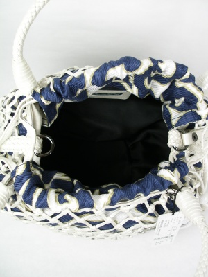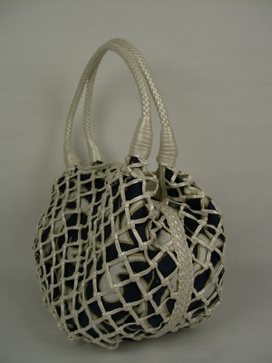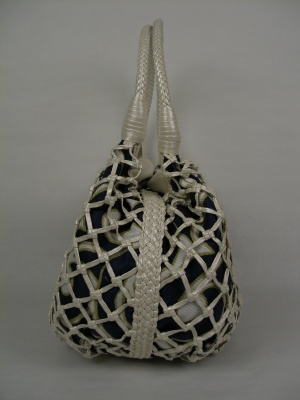 合皮のメッシュで内布はポリエステル85%・綿15%。外側のメッシュと内側の巾着は縫いつけ、中にはポケットが3つ。