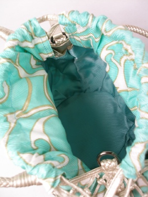 合皮のメッシュで内布はポリエステル85%・綿15%。外側のメッシュと内側の巾着は縫いつけ、中にはポケットが3つ。