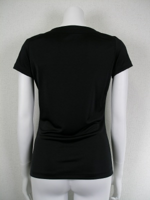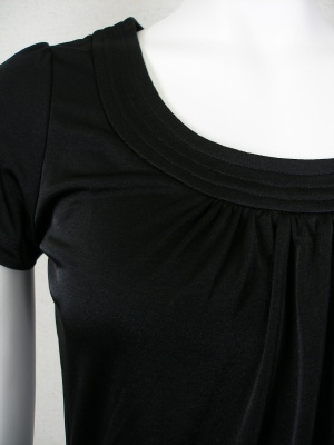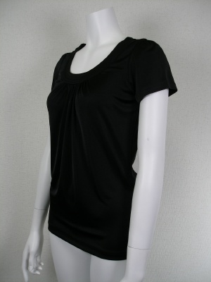 光沢のあるポリエステル素材で、シワになりません。1枚で着ても透けづらく、ジャケットのインナーとしても使いやすいカットソーです。