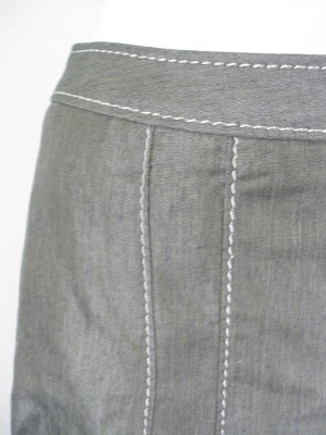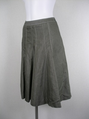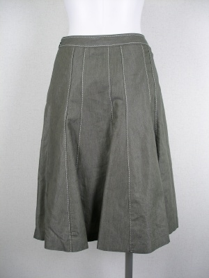 麻混のカジュアル素材で、裾に向かって広がるフレアースカート。白のステッチがアクセントです。裏地はポリエステル100%。
