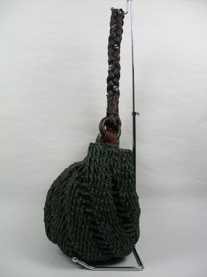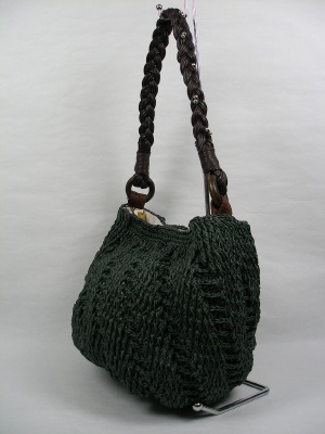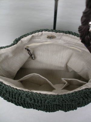内側は白×ベージュのストライプで綿素材、ポケット3つ。コロンとした形のナチュラルなバッグ。