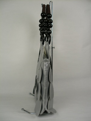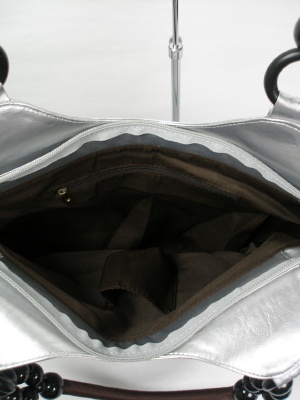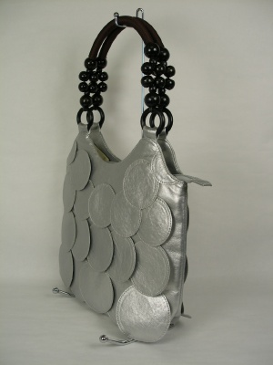 丸いパーツは上部のみ縫いつけ、ウロコのような感じになっています。両面とも同じ仕様。メタリックなシルバーが夏らしいバッグです。