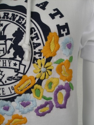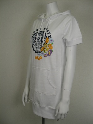 ロング丈のスポーティーなパーカーですが、お花の刺繍で少しガーリーに。長袖Tシャツを重ね着しても可愛いですよ。