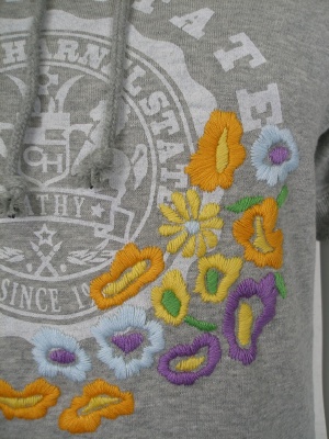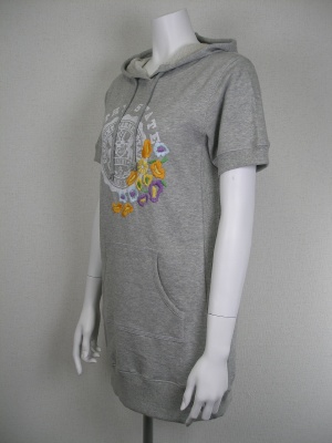 ロング丈のスポーティーなパーカーですが、お花の刺繍で少しガーリーに。長袖Tシャツを重ね着しても可愛いですよ。