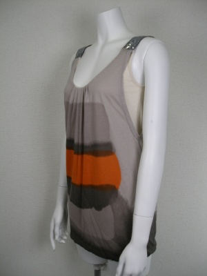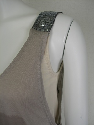 シンプルなタンクトップとルーズなタンクトップの裾をつなげたバルーンデザインですが、ボリュームは控えめです。ストラップには小さなスパンコールがぎっしり!