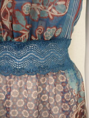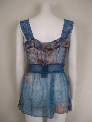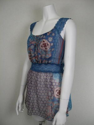 ストラップとウエスト部分のストレッチレースが繊細なシルクのブラウス。裏地は無いのでキャミソールなどを重ね着して。