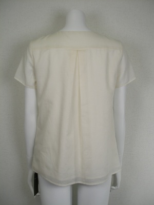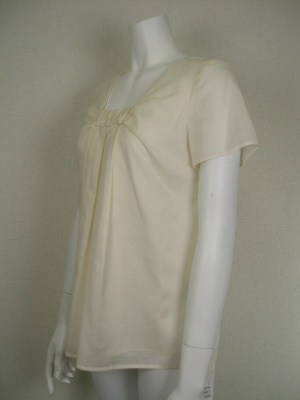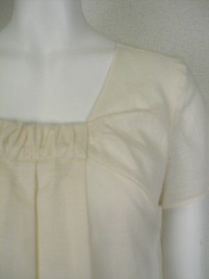 スクエアカットの襟元にギャザーを寄せえてさらにタックをもてせてふんわり感を出したブラウスチュニック。