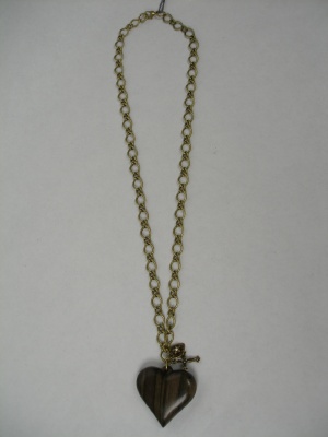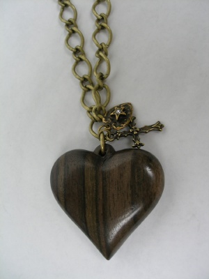 ウッディ素材の大きなハートに、小さなクロスとハートのチャームがついたペンダントネックレス。太目のチェーンもアクセントに。