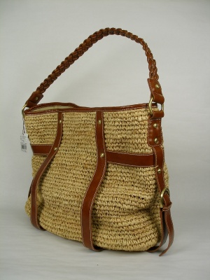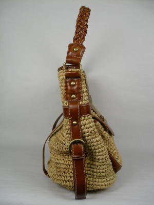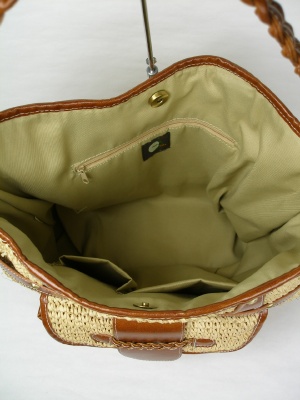 ベージュ部分はラフィア、ブラウン部分は合皮で内側は布張り。クタッと柔らかめのナチュラルバッグ。