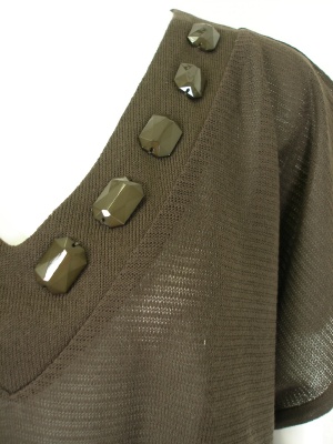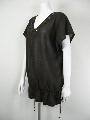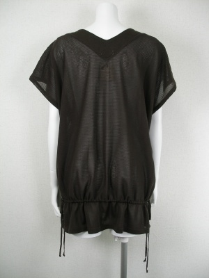 シャリッとした素材のニットチュニック。裾にヒモが通してあり、両端で絞るとブラウジングできます。やや透けますので重ね着してください。