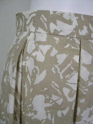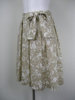 綿100%の柔らかい素材で、裏地はキュプラ。リボンベルトは取り外せます。オフホワイトとベージュの上品な柄。