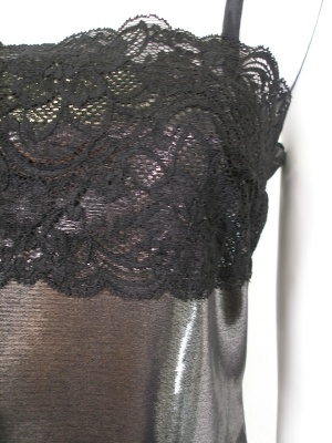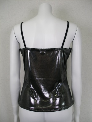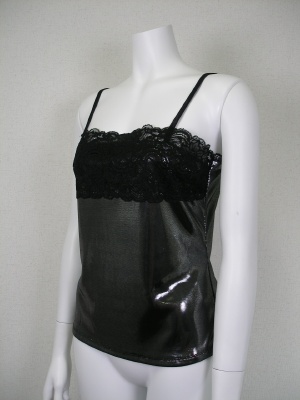 ポリエステルの生地に箔プリントしたツヤツヤキャミソール。レース部分は光りません。