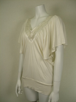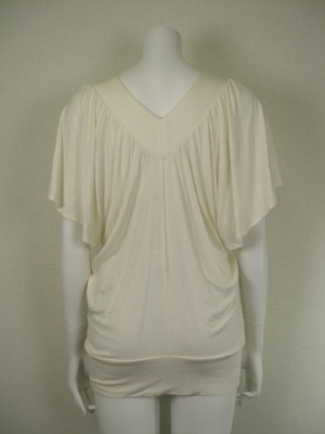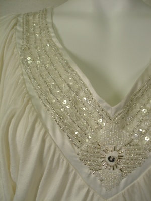 ストレッチ素材で落ち感があるので、ギャザーが広がらずスッキリしたシルエットに。ネックラインはポリエステルのサテン地にシルバーのビーズとクリアのスパンコールを縫いつけ。