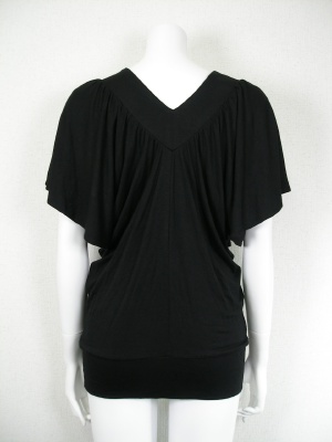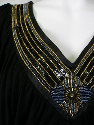 ストレッチ素材で落ち感があるので、ギャザーが広がらずスッキリしたシルエットに。ネックラインはポリエステルのサテン地にゴールドのビーズと黒のスパンコールを縫いつけ。